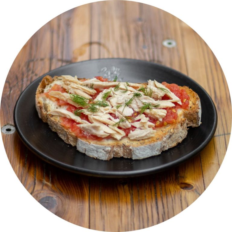 Ingredientes: Pan Pretzel, anchoas, tomates cherry, mantequilla ahumada de café descafeinado, cebolla roja, piparras, almendra marcona, aceite de albahaca, albahaca fresca.