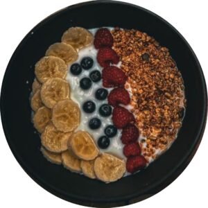 Yogurt ecológico, fruta de temporada, coco molido y granola.