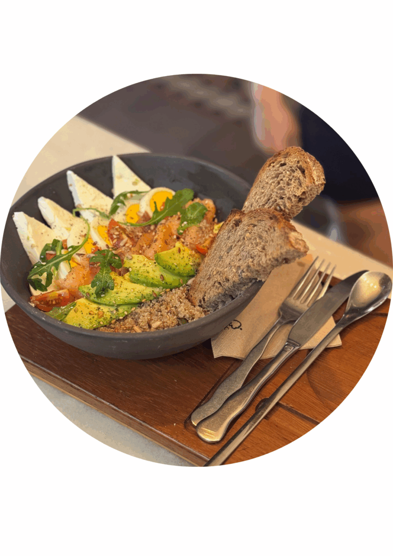 Quinoa, queso fresco, huevo, salmón, aguacate, cherry, rúcula y finaliza con un mix de 6 semillas, aceite de albahaca y sal negra