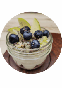 Yogurt ecológico, fruta de temporada, mermelada, galleta molida y cacao en polvo.